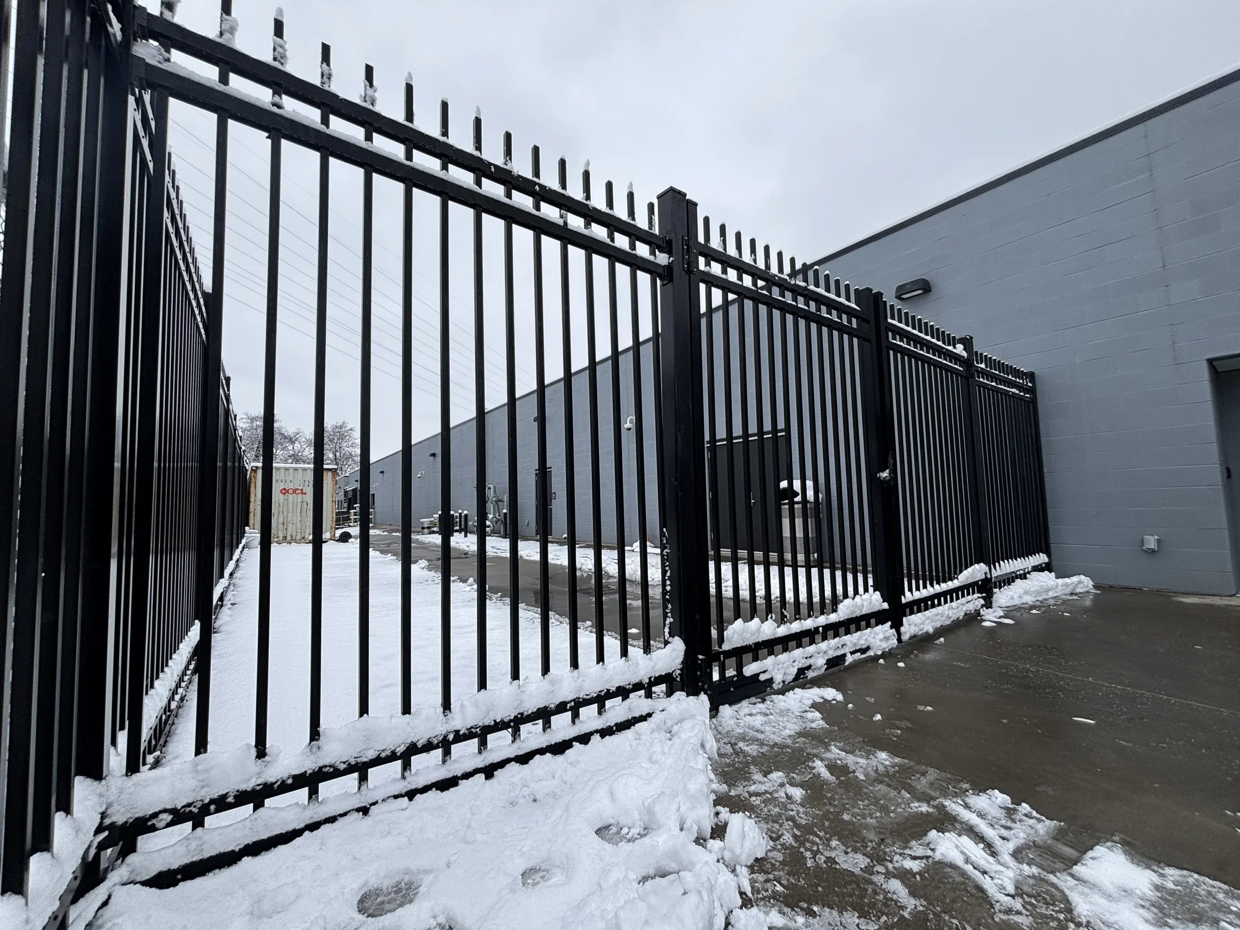 The project also includes multiple slide gates and a custom-designed set of ornamental gates for the dumpster enclosure, combining security with architectural detail.